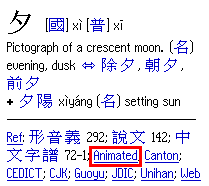למעשה באתר Zhongwen ישנה אפשרות לצפות בסדר משיכת המכחול. אם נחזור לדוגמא של הסימנייה 夕 שהזכרתי למעלה, נראה שבתחתית הדף יש קישור הנקרא ,Animated. סימנתי אותו במסגרת אדומה בתרשים שמשמאל